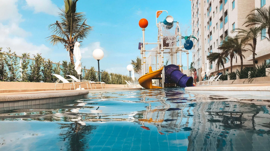 sauna submersa e piscina infantil. Além de uma quadra poliesportiva,